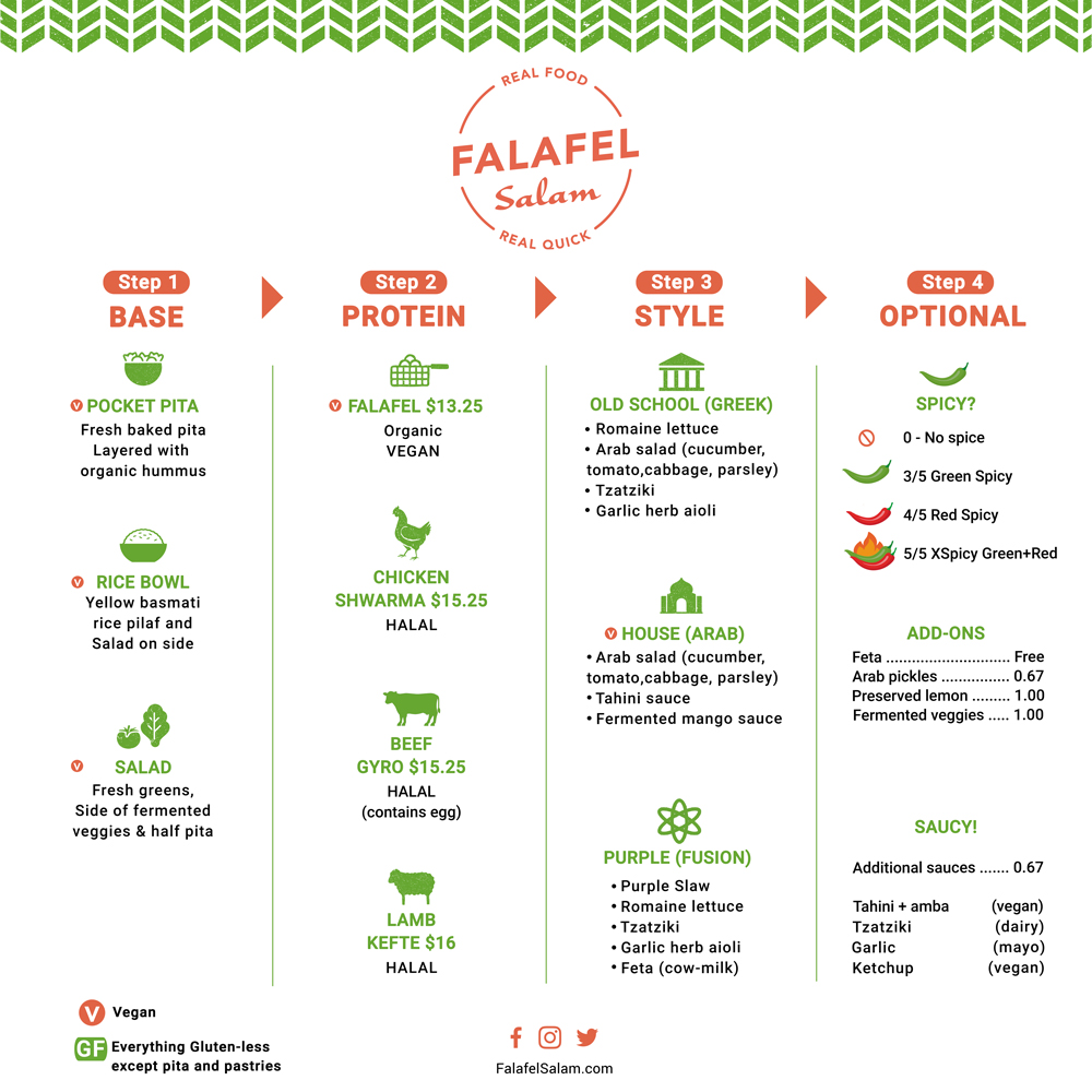 By nature, our food is mostly vegetarian and vegan. We keep our falafel fryer vegan & gluten free. All the food is Gluten-Free with the exception of the pita and Baklava. Everything is soy and nut free except for the baklava of course. No eggs or dairy, no problem. Just let us know.